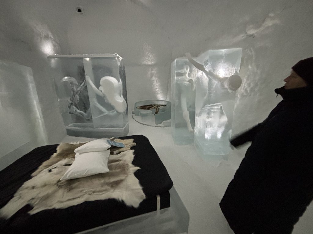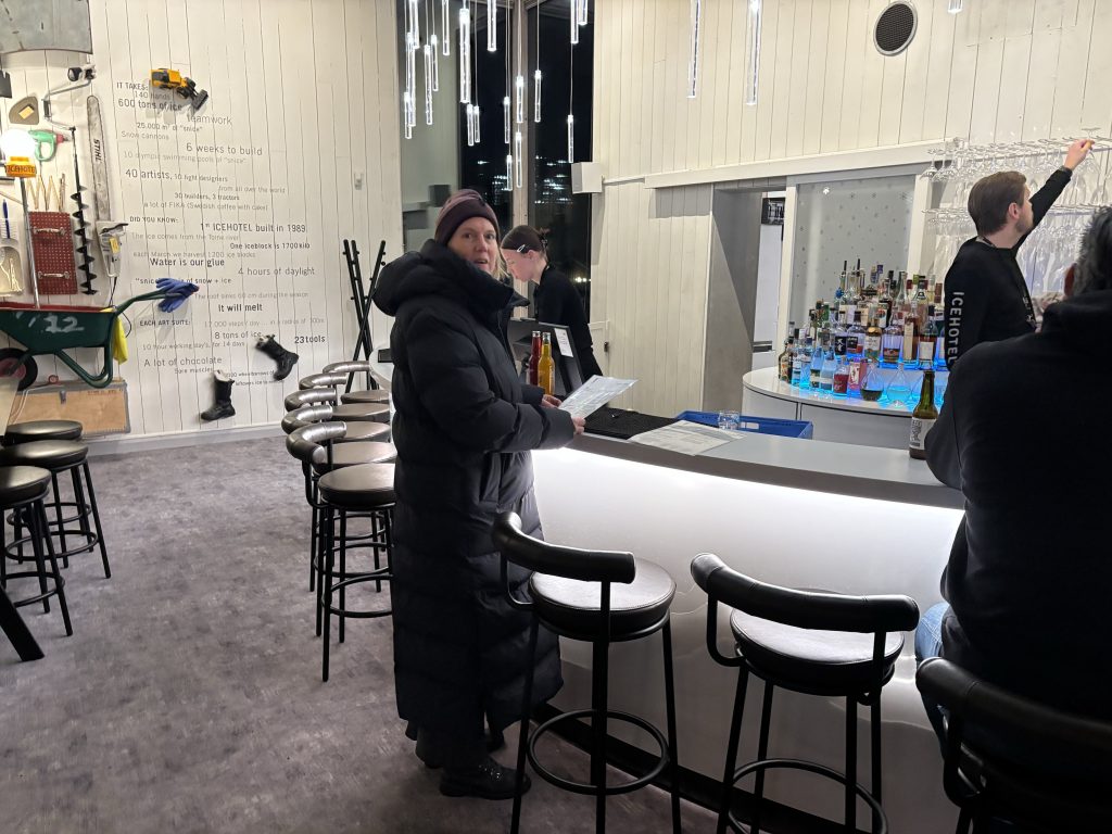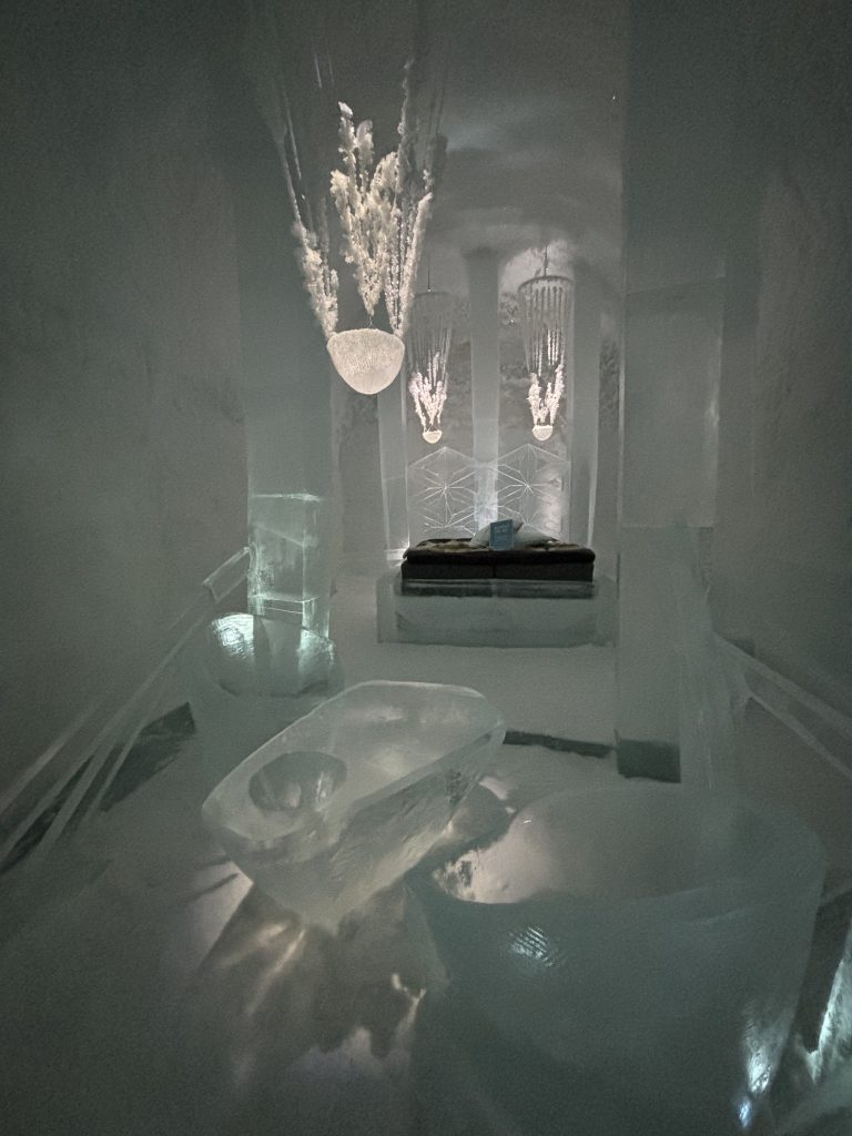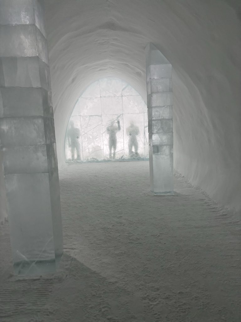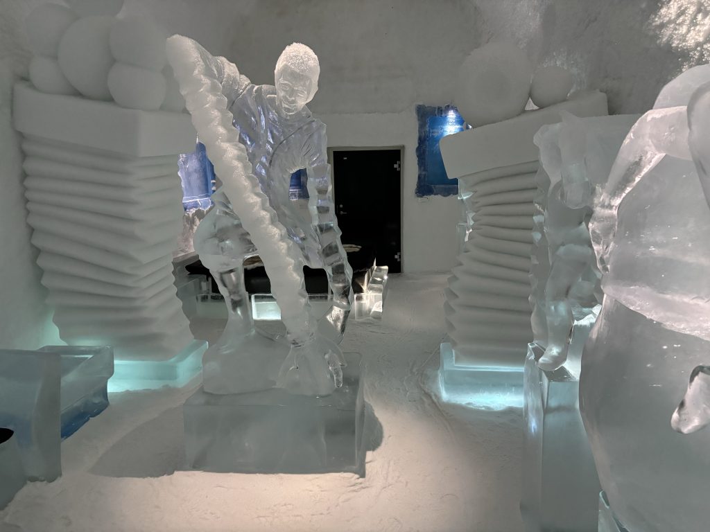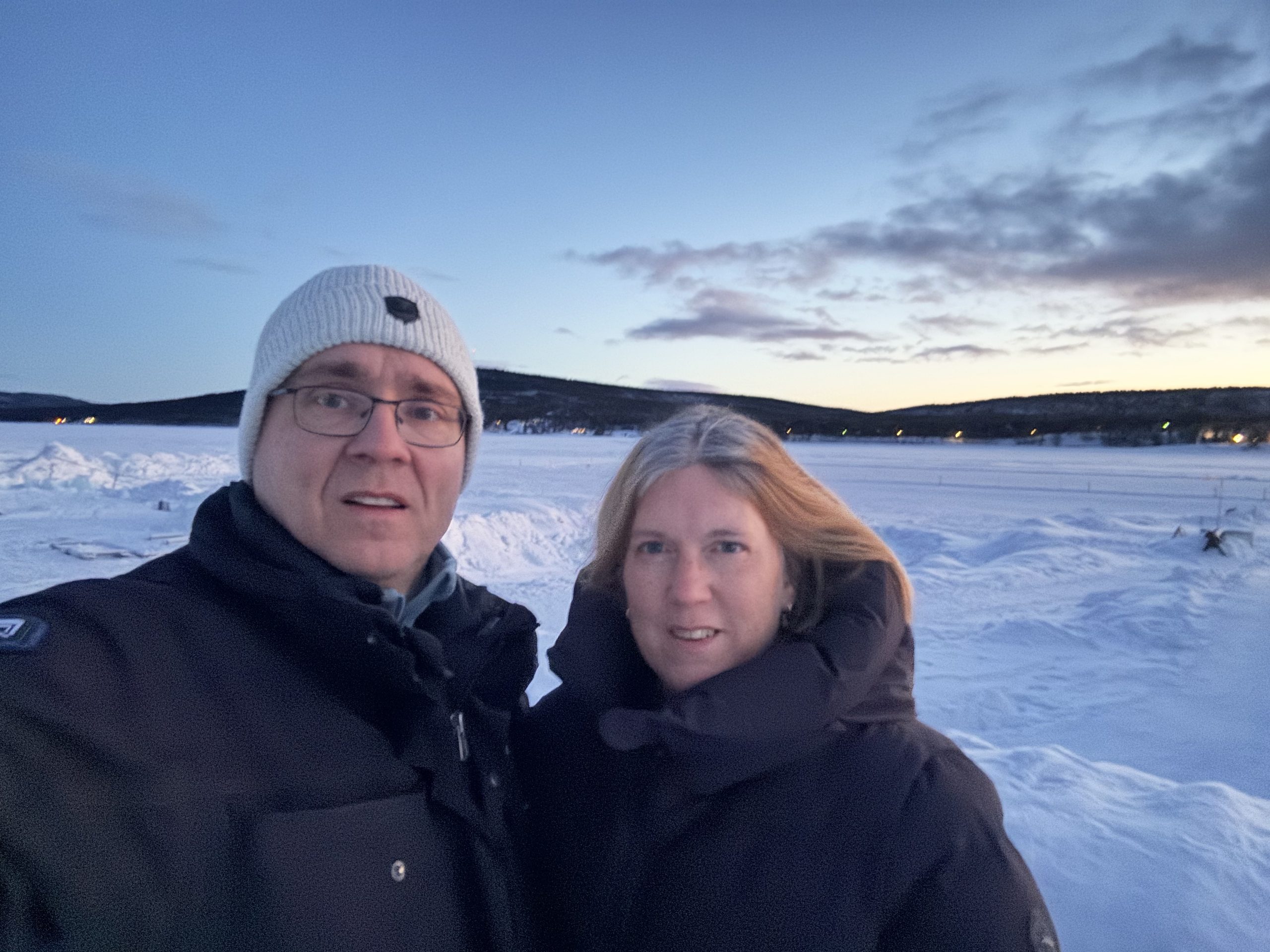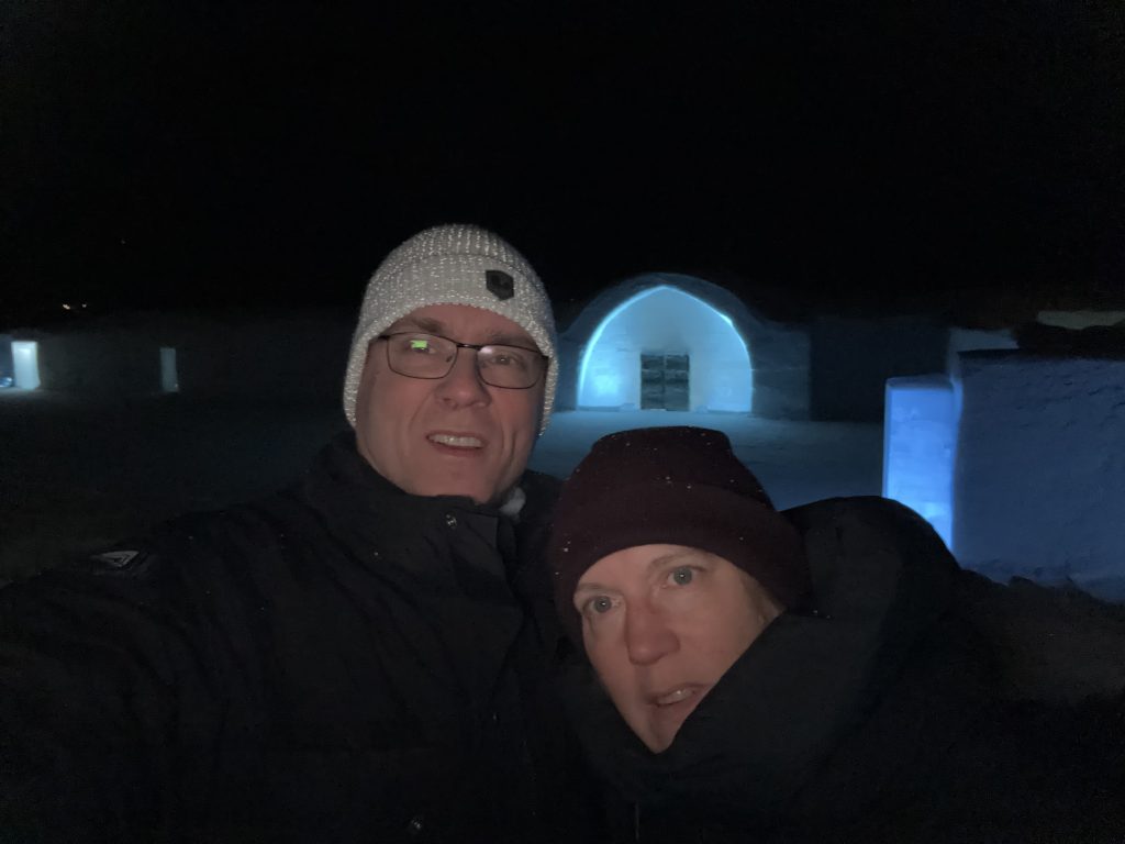 Äntligen fick Linda sin 50-årspresent. En övernattning på ishotellet i Jukkasjärvi med besök på Jokkmokks marknad efteråt. När vi kom upp till Luleå på fredagen var det väl ca 12 minusgrader. Det blev varmare i takt med att vi kom längre upp i landet och när vi nådde Jukkasjärvi var det ca -5 grader. Ruhndvandring och förberedelse inför natten innan vi gick och åt en jättegod måltid. Förrätt var rentartar på innanlår med rostade rotfruktschips, svamp och en god sås till. Huvudrätt var fjällröding med potatis och sedan en god efterrätt. På väg till hotell restaurangen fick vi även se Norrsken. Sedan var det dags att krypa ner och sova. Det var inte världens skönaste sömn eftersom det var obekvämt underlag men man frös inte i sovsäcken iallafall. Inne i rummen var det ca -5 till -8 grader. Dagen efter blev det bastu och sedan frukost. Rummen skulle man ha lämnat redan 8.30 så det blev ingen lång sovmorgon precis. Efter att ha checkat ut vid 11 tiden så åkte vi mot Jokkmokk med tankning i Kiruna, genomfart genom Gällivare och sedan lite kraftverk på vägen till Jokkmokk.