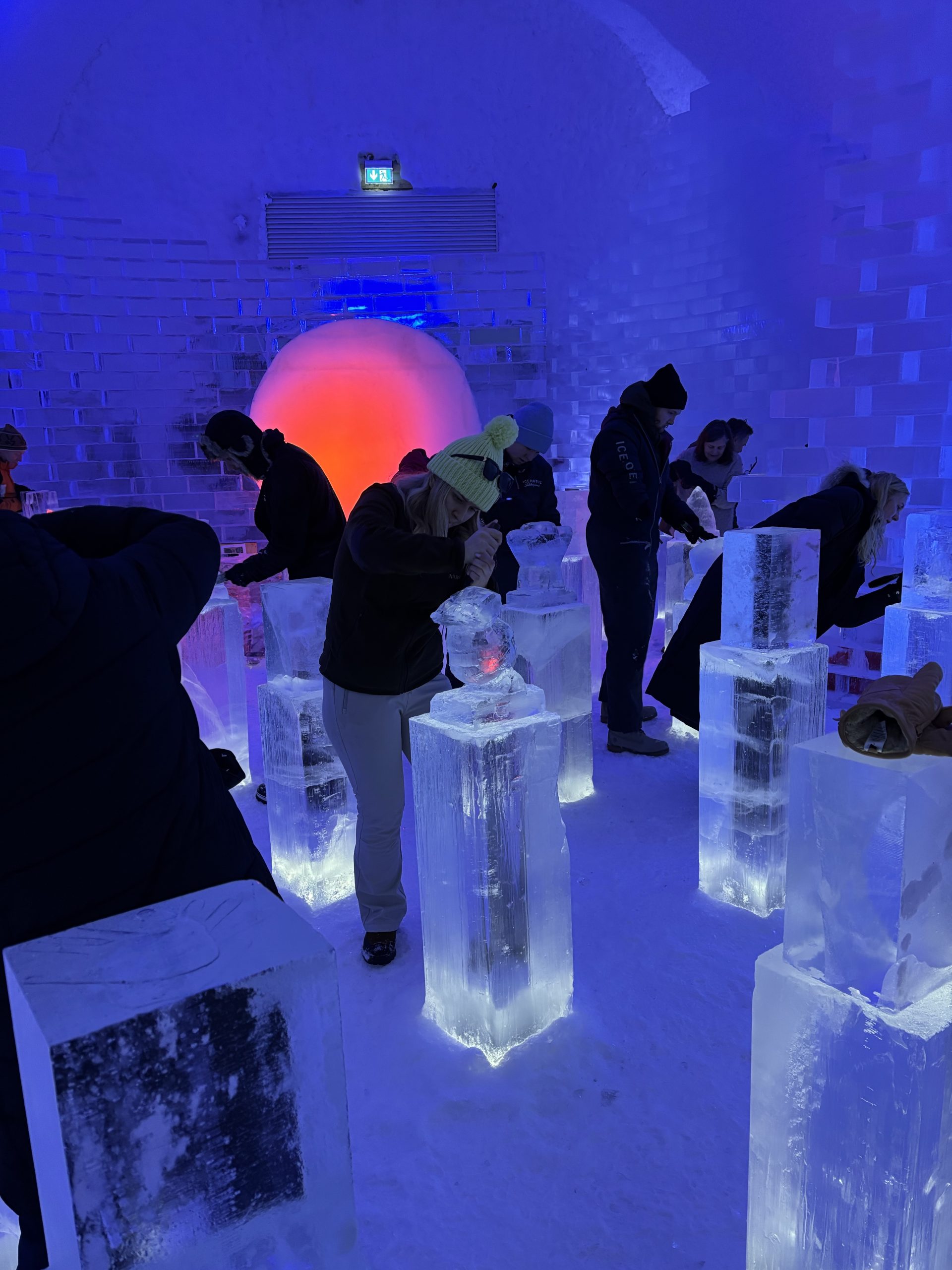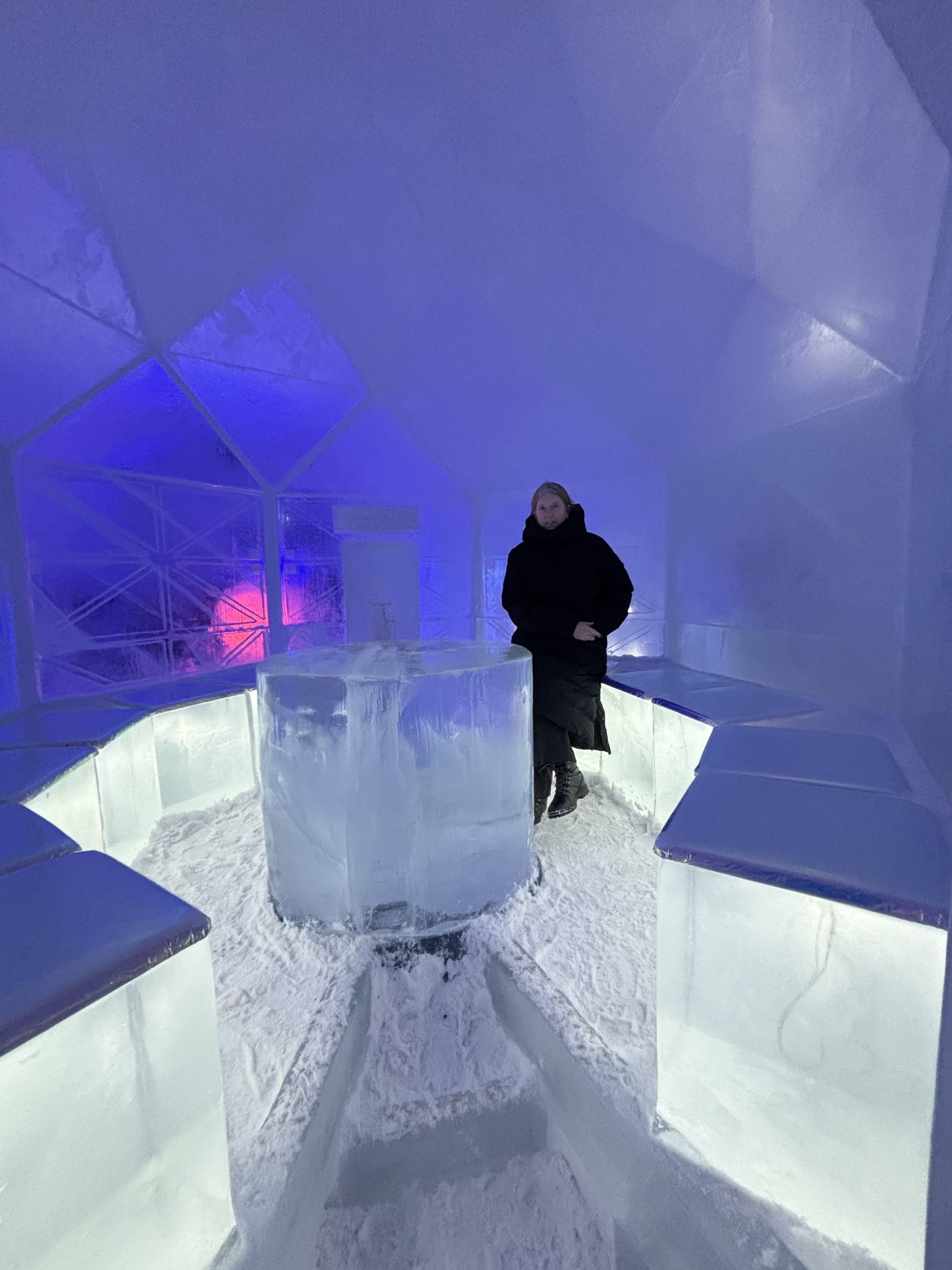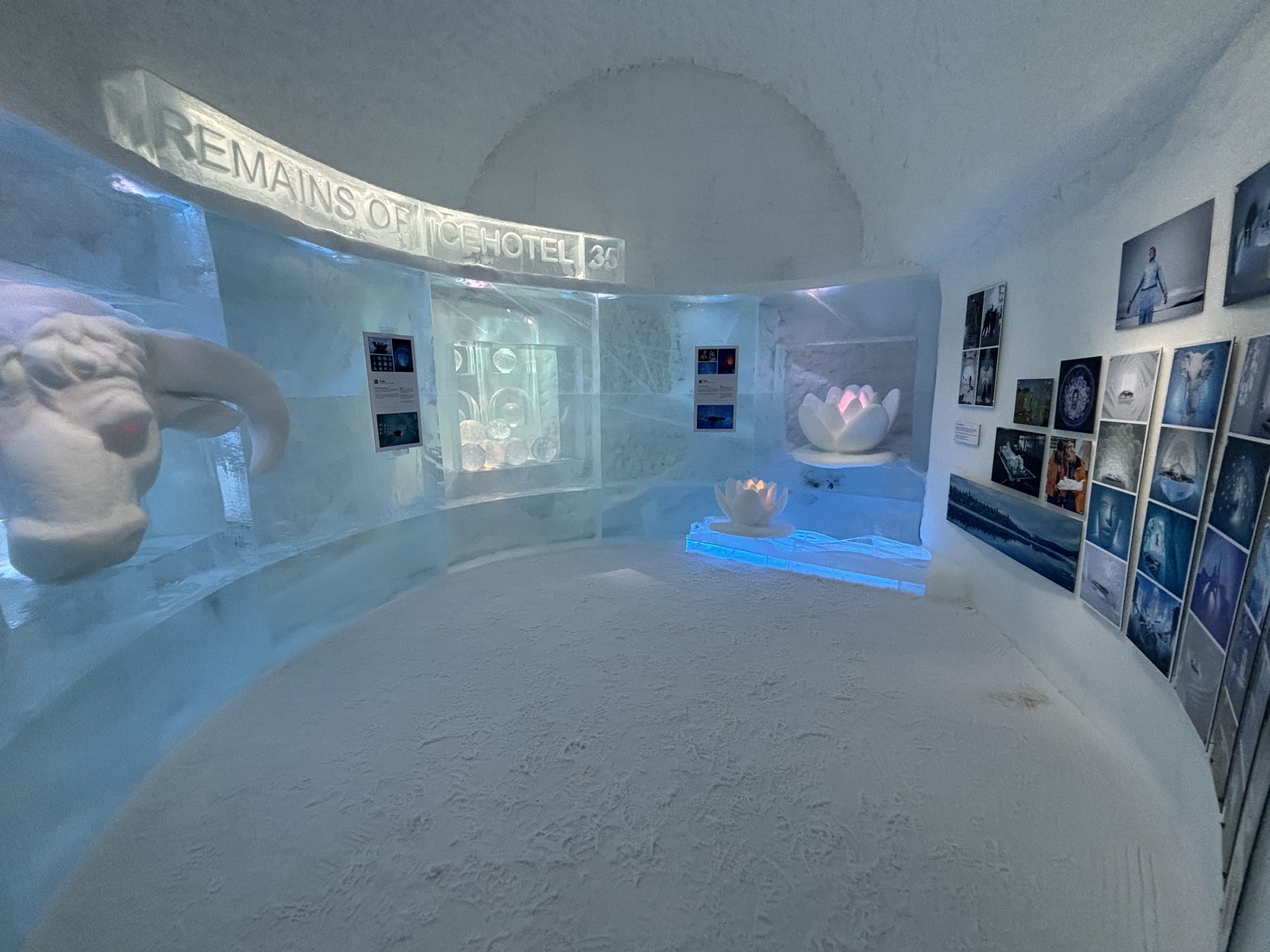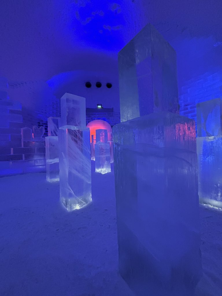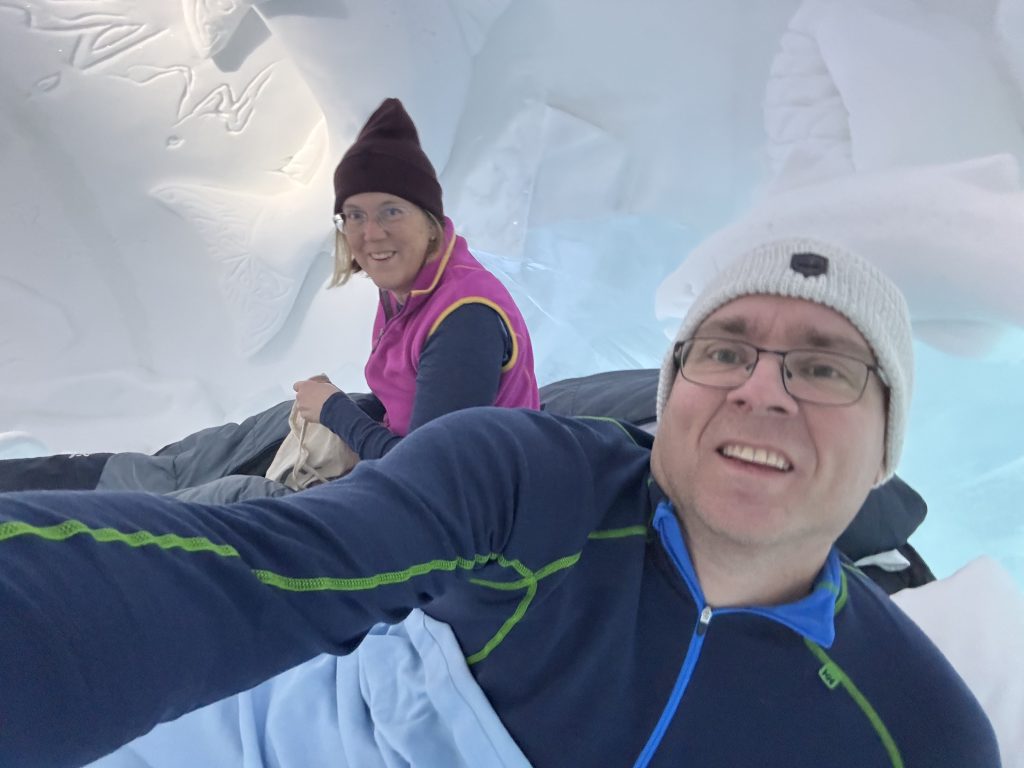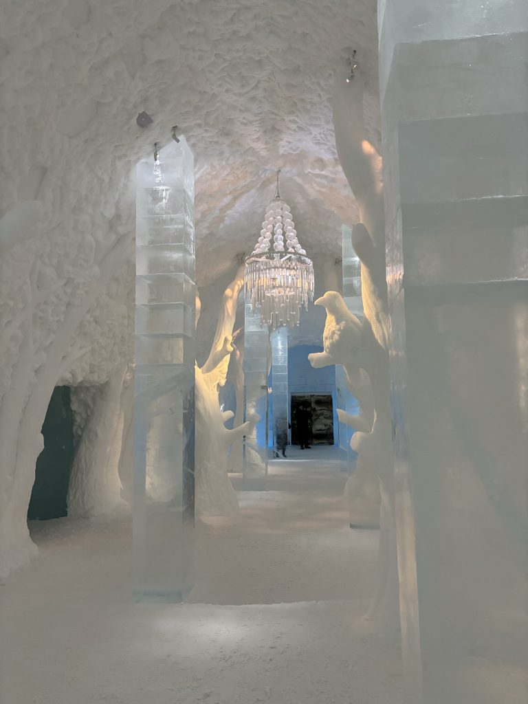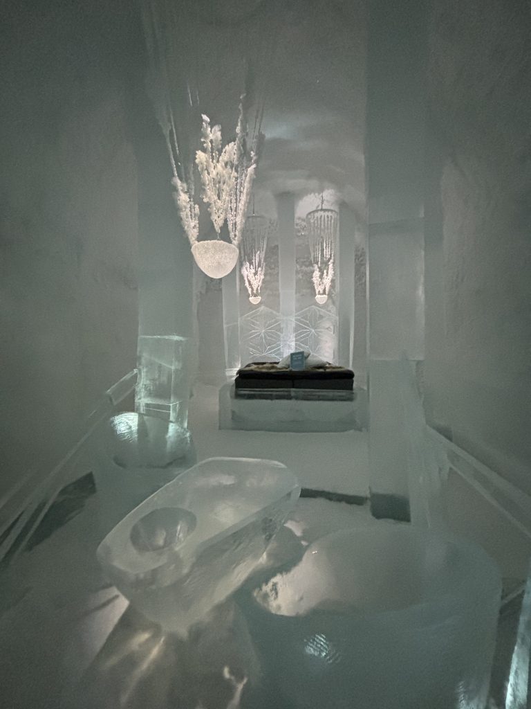Äntligen fick Linda sin 50-årspresent. En övernattning på ishotellet i Jukkasjärvi med besök på Jokkmokks marknad efteråt. När vi kom upp till Luleå på fredagen var det väl ca 12 minusgrader. Det blev varmare i takt med att vi kom längre upp i landet och när vi nådde Jukkasjärvi var det ca -5 grader. Ruhndvandring och förberedelse inför natten innan vi gick och åt en jättegod måltid. Förrätt var rentartar på innanlår med rostade rotfruktschips, svamp och en god sås till. Huvudrätt var fjällröding med potatis och sedan en god efterrätt. På väg till hotell restaurangen fick vi även se Norrsken. Sedan var det dags att krypa ner och sova. Det var inte världens skönaste sömn eftersom det var obekvämt underlag men man frös inte i sovsäcken iallafall. Inne i rummen var det ca -5 till -8 grader. Dagen efter blev det bastu och sedan frukost. Rummen skulle man ha lämnat redan 8.30 så det blev ingen lång sovmorgon precis. Efter att ha checkat ut vid 11 tiden så åkte vi mot Jokkmokk med tankning i Kiruna, genomfart genom Gällivare och sedan lite kraftverk på vägen till Jokkmokk.