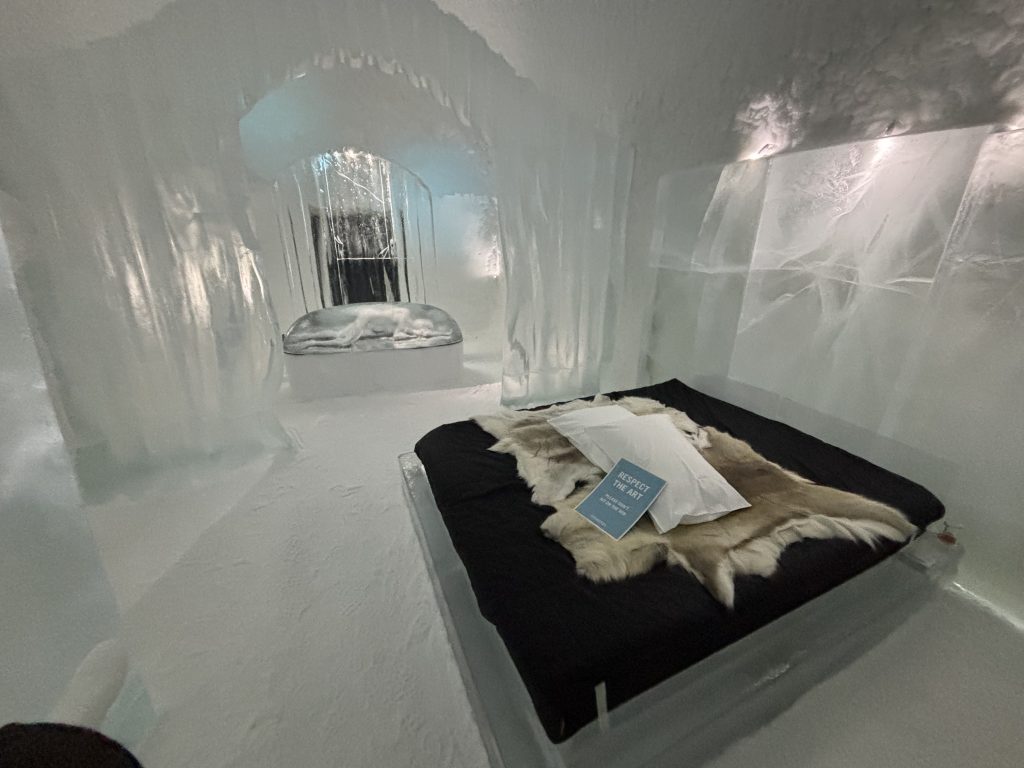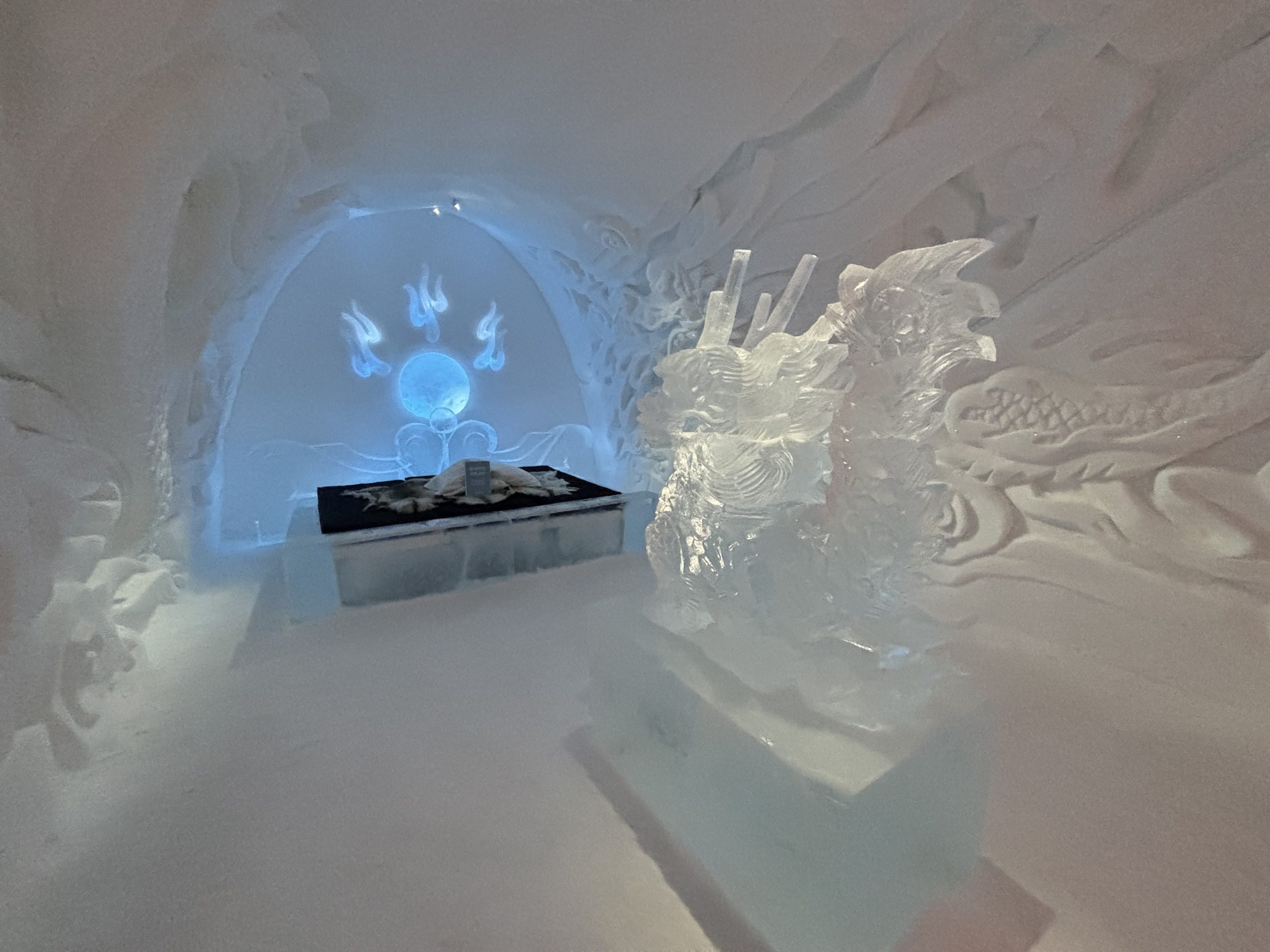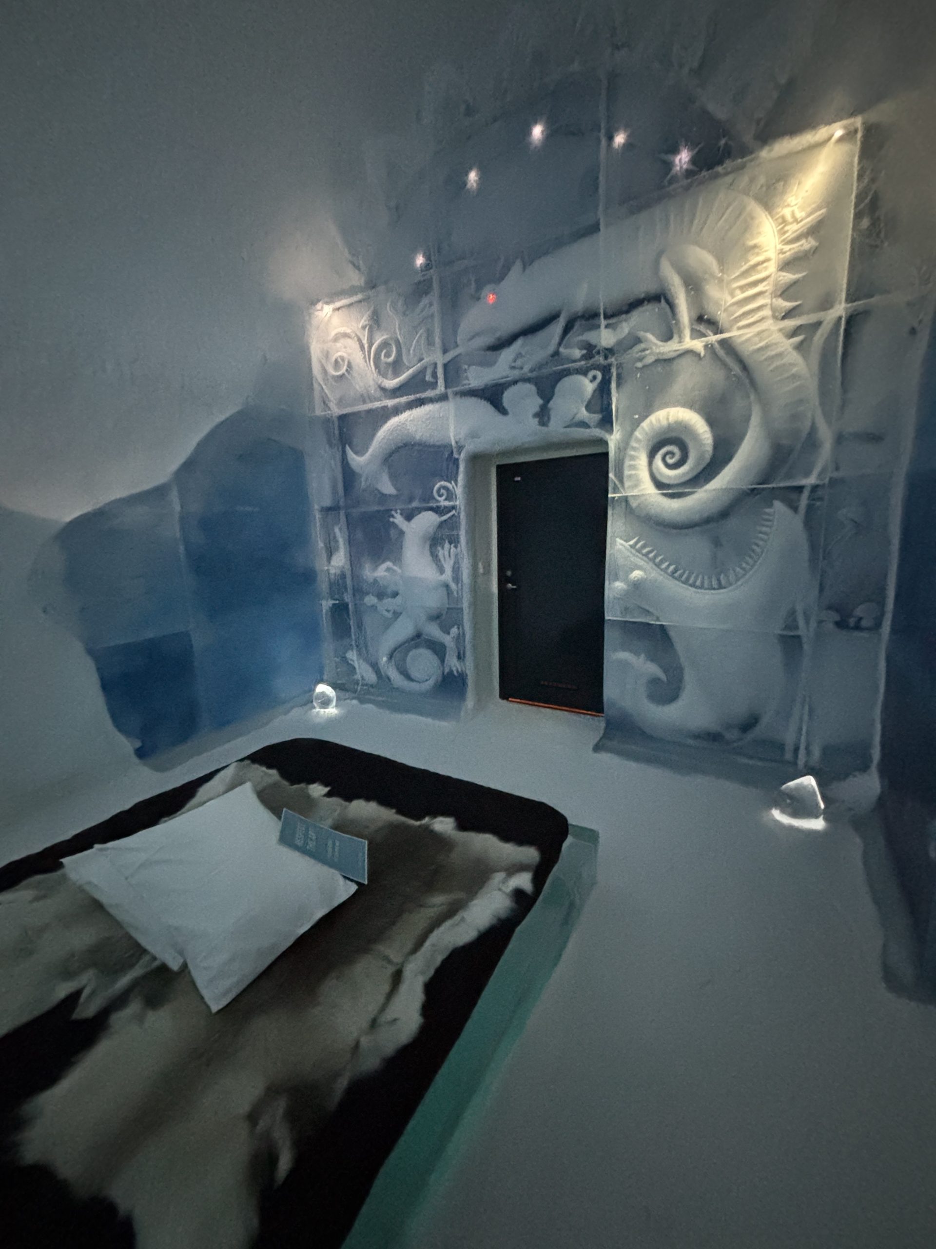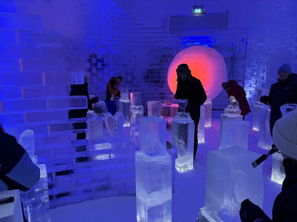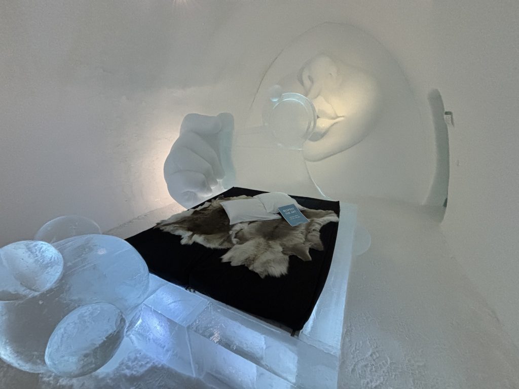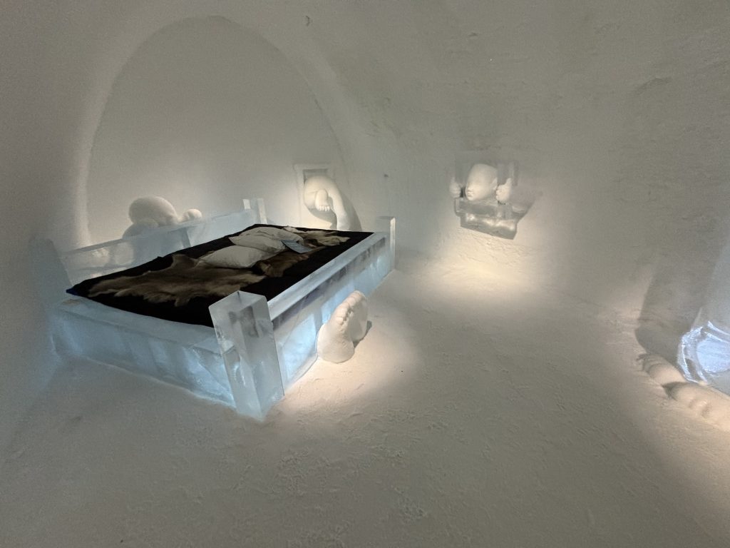 Äntligen fick Linda sin 50-årspresent. En övernattning på ishotellet i Jukkasjärvi med besök på Jokkmokks marknad efteråt. När vi kom upp till Luleå på fredagen var det väl ca 12 minusgrader. Det blev varmare i takt med att vi kom längre upp i landet och när vi nådde Jukkasjärvi var det ca -5 grader. Ruhndvandring och förberedelse inför natten innan vi gick och åt en jättegod måltid. Förrätt var rentartar på innanlår med rostade rotfruktschips, svamp och en god sås till. Huvudrätt var fjällröding med potatis och sedan en god efterrätt. På väg till hotell restaurangen fick vi även se Norrsken. Sedan var det dags att krypa ner och sova. Det var inte världens skönaste sömn eftersom det var obekvämt underlag men man frös inte i sovsäcken iallafall. Inne i rummen var det ca -5 till -8 grader. Dagen efter blev det bastu och sedan frukost. Rummen skulle man ha lämnat redan 8.30 så det blev ingen lång sovmorgon precis. Efter att ha checkat ut vid 11 tiden så åkte vi mot Jokkmokk med tankning i Kiruna, genomfart genom Gällivare och sedan lite kraftverk på vägen till Jokkmokk.