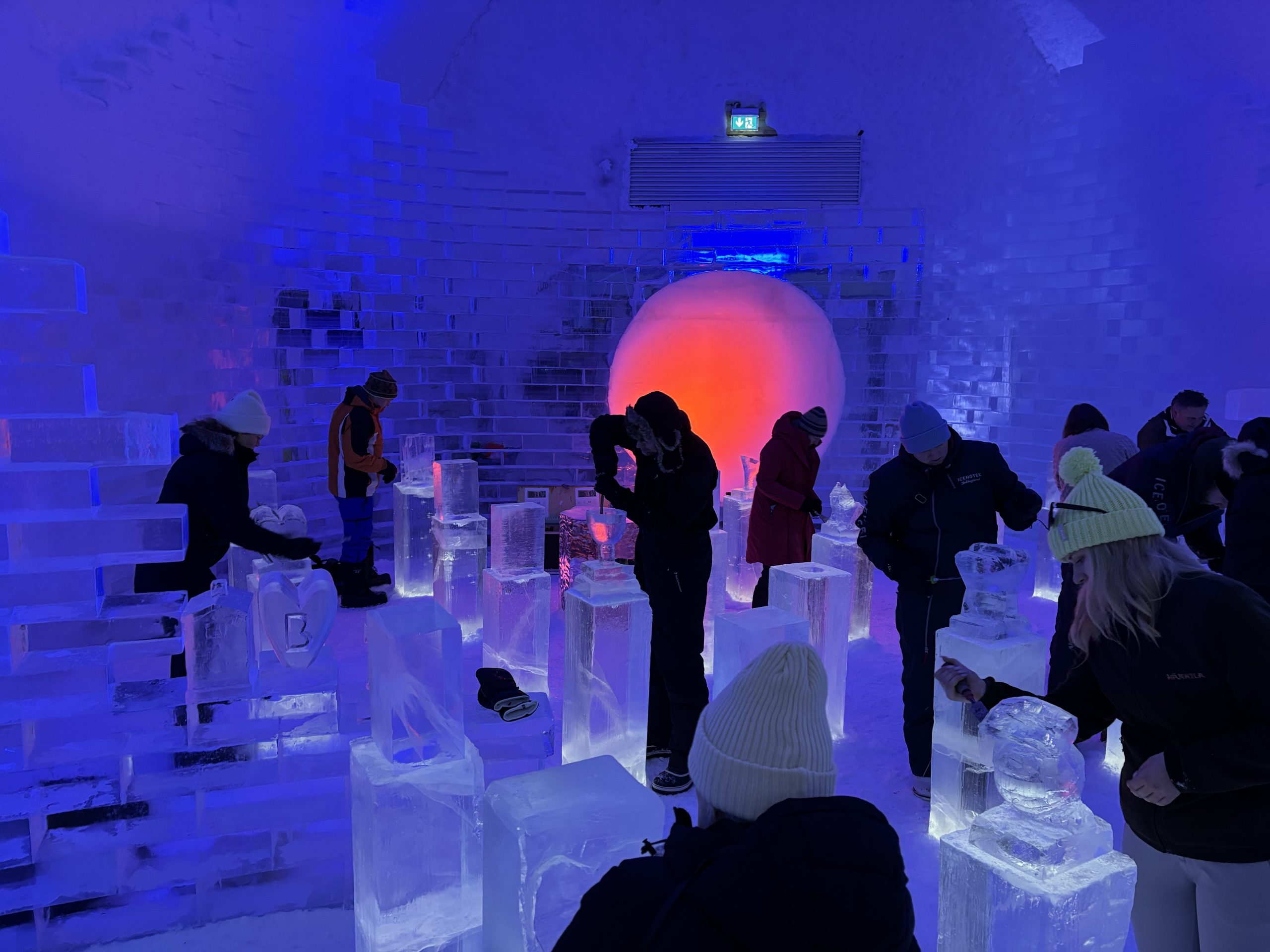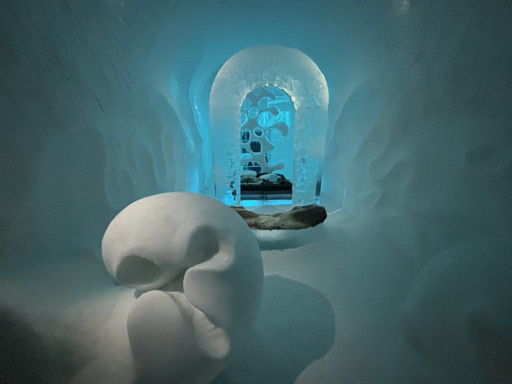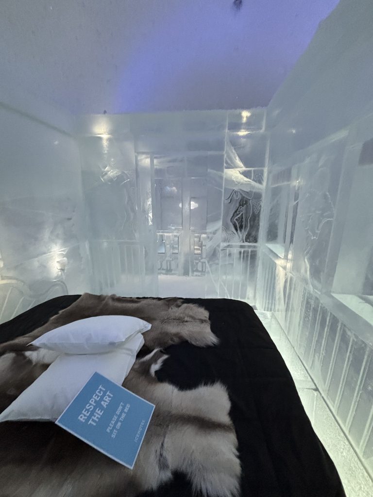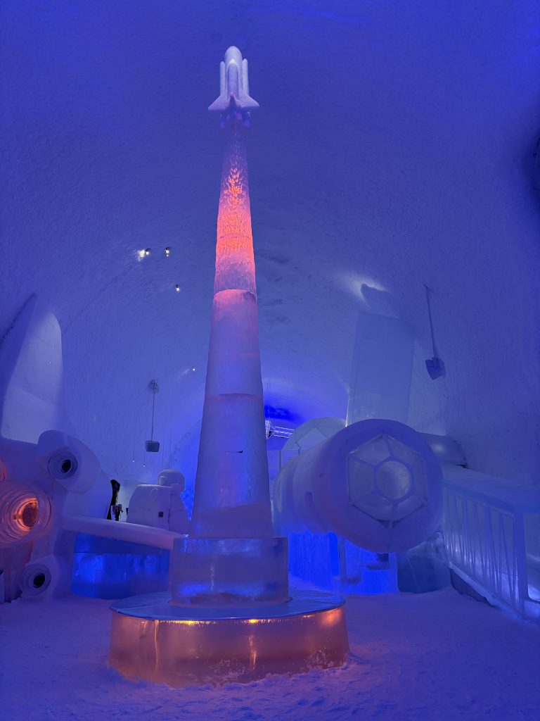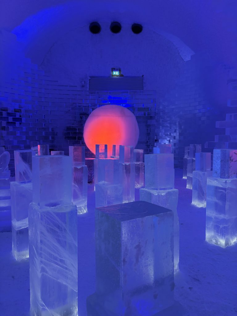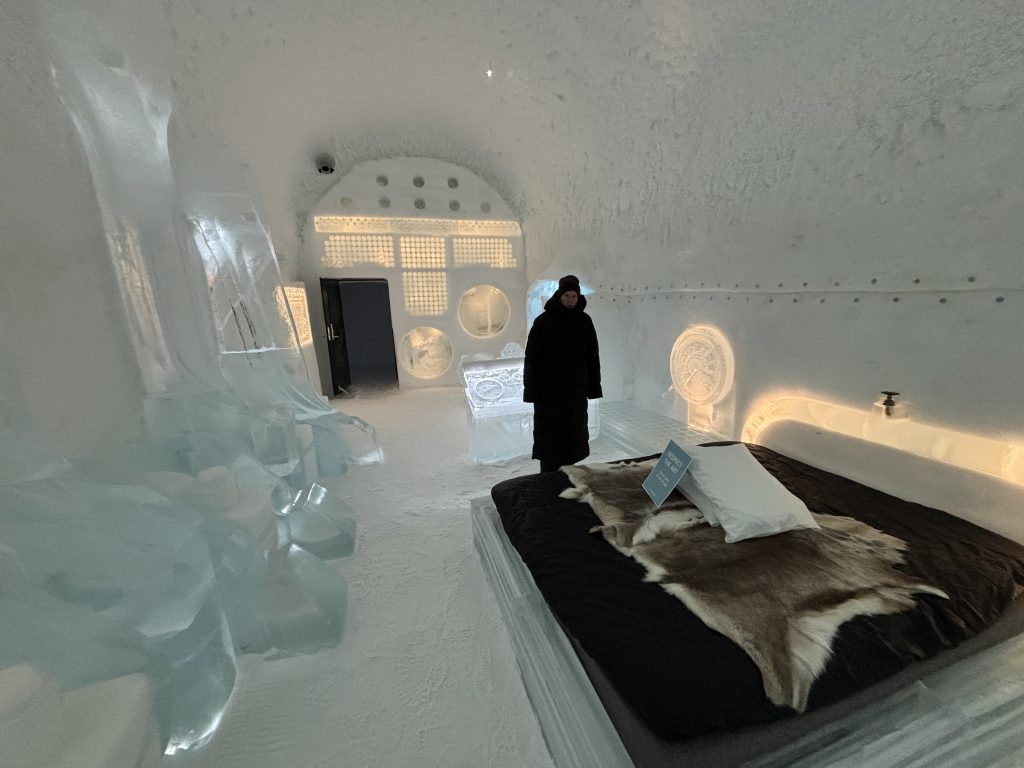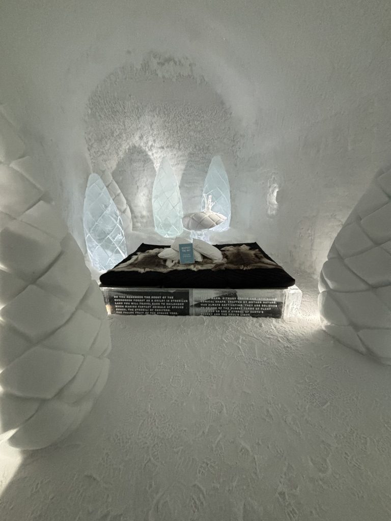 Äntligen fick Linda sin 50-årspresent. En övernattning på ishotellet i Jukkasjärvi med besök på Jokkmokks marknad efteråt. När vi kom upp till Luleå på fredagen var det väl ca 12 minusgrader. Det blev varmare i takt med att vi kom längre upp i landet och när vi nådde Jukkasjärvi var det ca -5 grader. Ruhndvandring och förberedelse inför natten innan vi gick och åt en jättegod måltid. Förrätt var rentartar på innanlår med rostade rotfruktschips, svamp och en god sås till. Huvudrätt var fjällröding med potatis och sedan en god efterrätt. På väg till hotell restaurangen fick vi även se Norrsken. Sedan var det dags att krypa ner och sova. Det var inte världens skönaste sömn eftersom det var obekvämt underlag men man frös inte i sovsäcken iallafall. Inne i rummen var det ca -5 till -8 grader. Dagen efter blev det bastu och sedan frukost. Rummen skulle man ha lämnat redan 8.30 så det blev ingen lång sovmorgon precis. Efter att ha checkat ut vid 11 tiden så åkte vi mot Jokkmokk med tankning i Kiruna, genomfart genom Gällivare och sedan lite kraftverk på vägen till Jokkmokk.