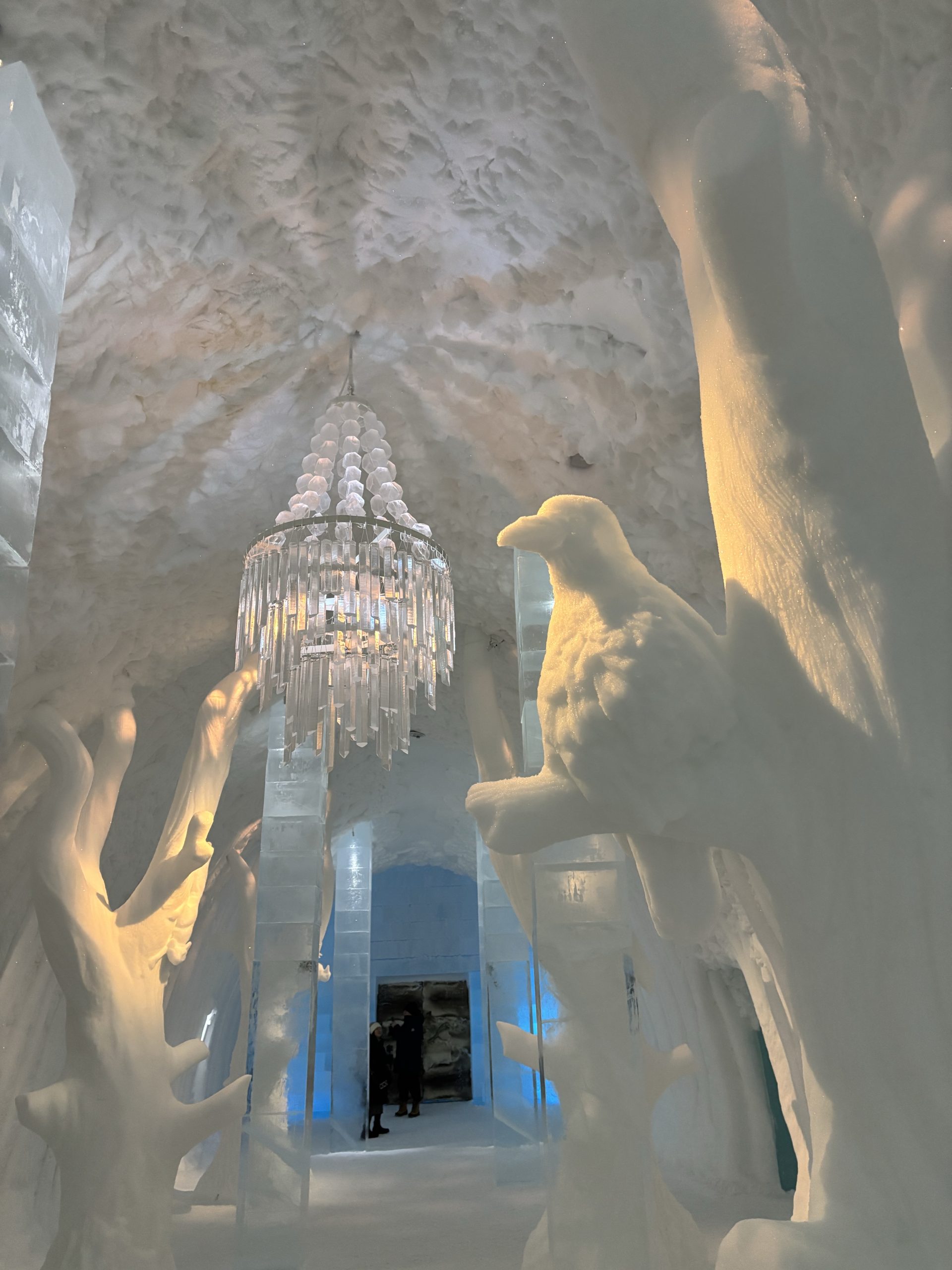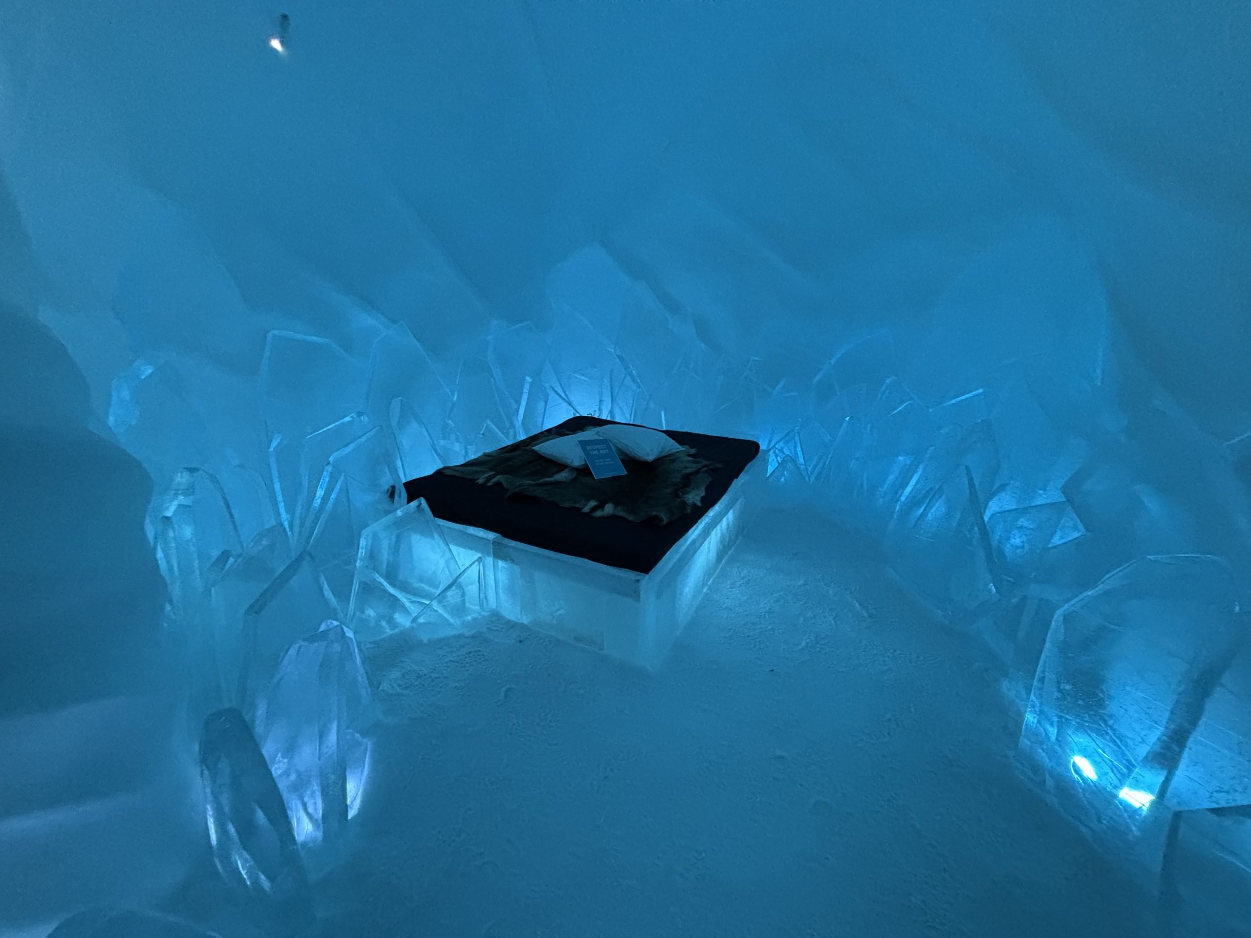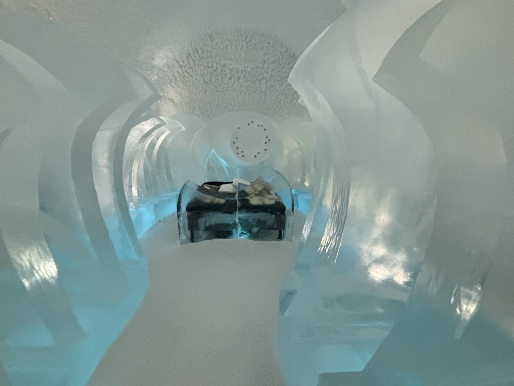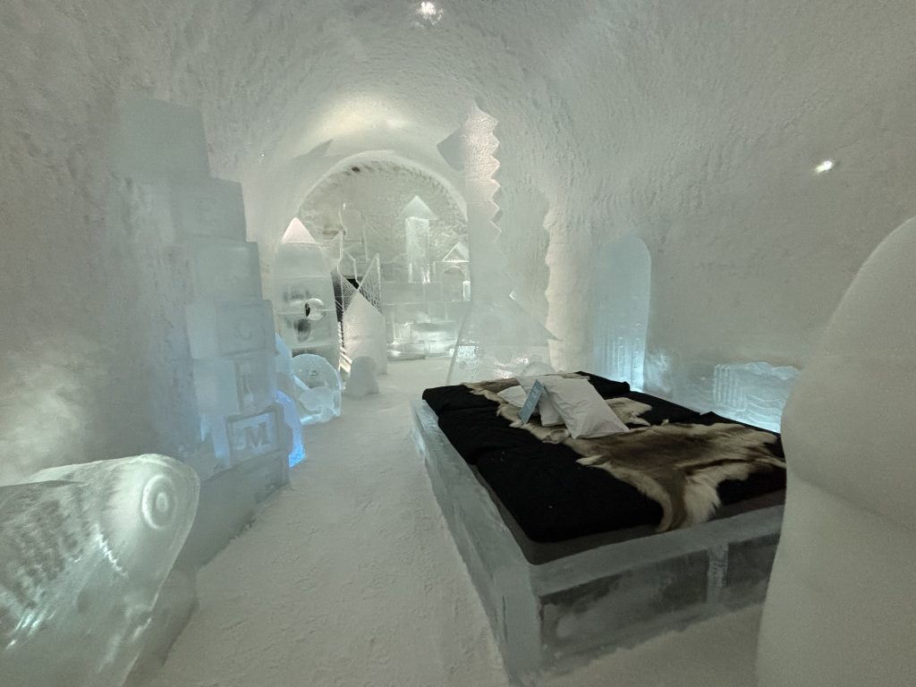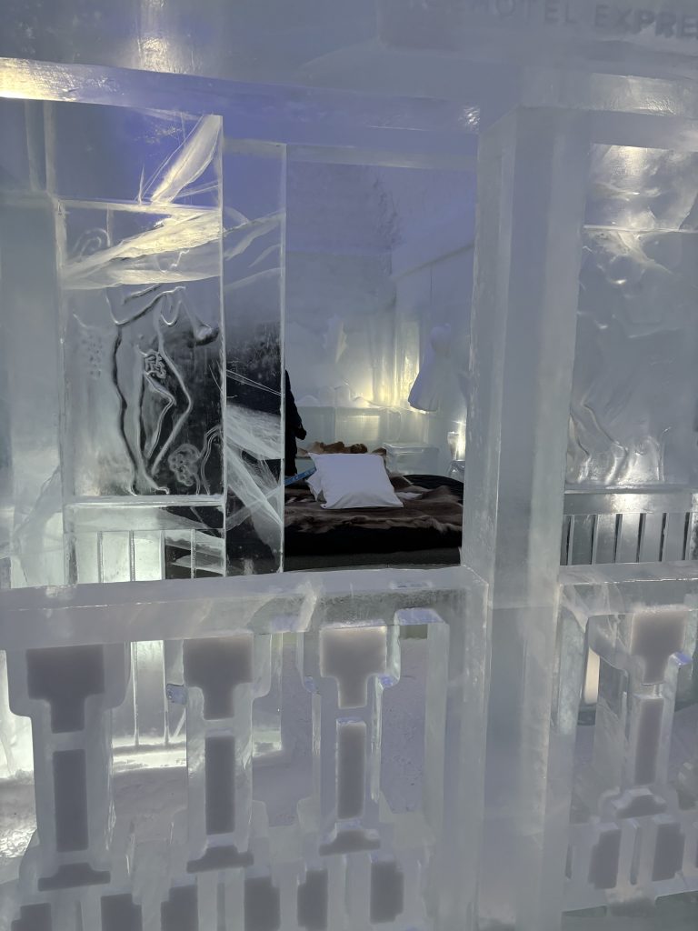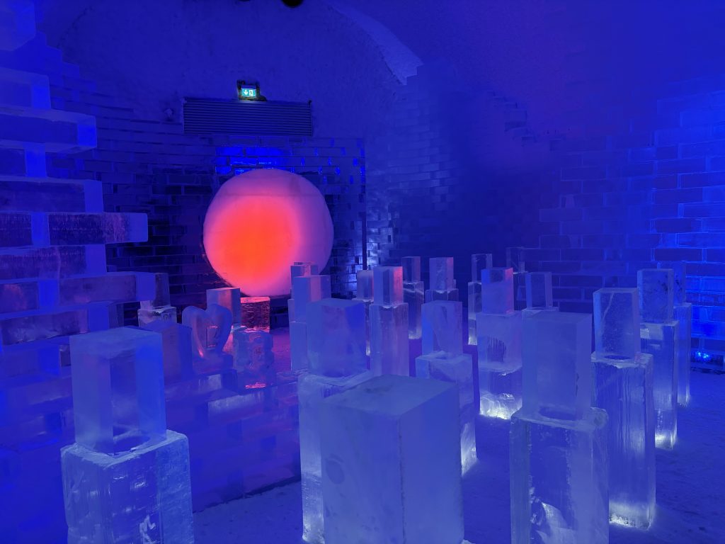 Äntligen fick Linda sin 50-årspresent. En övernattning på ishotellet i Jukkasjärvi med besök på Jokkmokks marknad efteråt. När vi kom upp till Luleå på fredagen var det väl ca 12 minusgrader. Det blev varmare i takt med att vi kom längre upp i landet och när vi nådde Jukkasjärvi var det ca -5 grader. Ruhndvandring och förberedelse inför natten innan vi gick och åt en jättegod måltid. Förrätt var rentartar på innanlår med rostade rotfruktschips, svamp och en god sås till. Huvudrätt var fjällröding med potatis och sedan en god efterrätt. På väg till hotell restaurangen fick vi även se Norrsken. Sedan var det dags att krypa ner och sova. Det var inte världens skönaste sömn eftersom det var obekvämt underlag men man frös inte i sovsäcken iallafall. Inne i rummen var det ca -5 till -8 grader. Dagen efter blev det bastu och sedan frukost. Rummen skulle man ha lämnat redan 8.30 så det blev ingen lång sovmorgon precis. Efter att ha checkat ut vid 11 tiden så åkte vi mot Jokkmokk med tankning i Kiruna, genomfart genom Gällivare och sedan lite kraftverk på vägen till Jokkmokk.