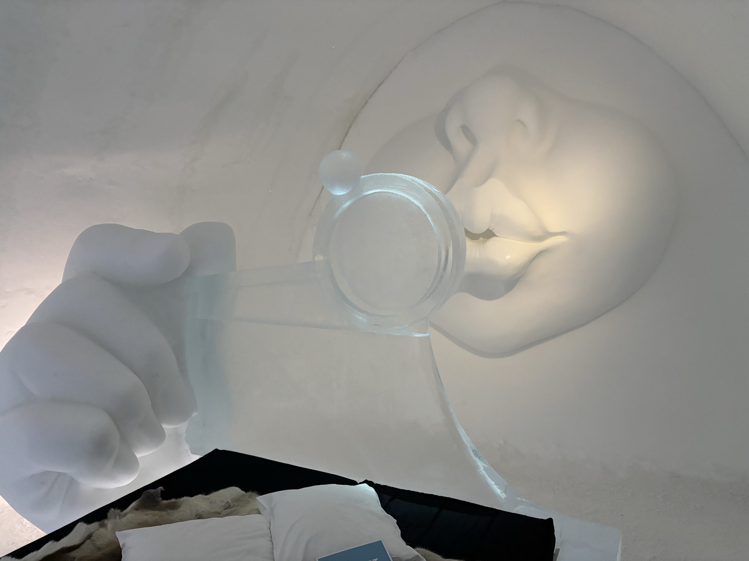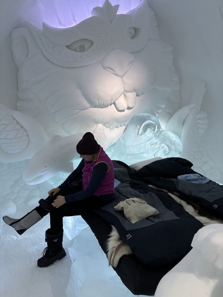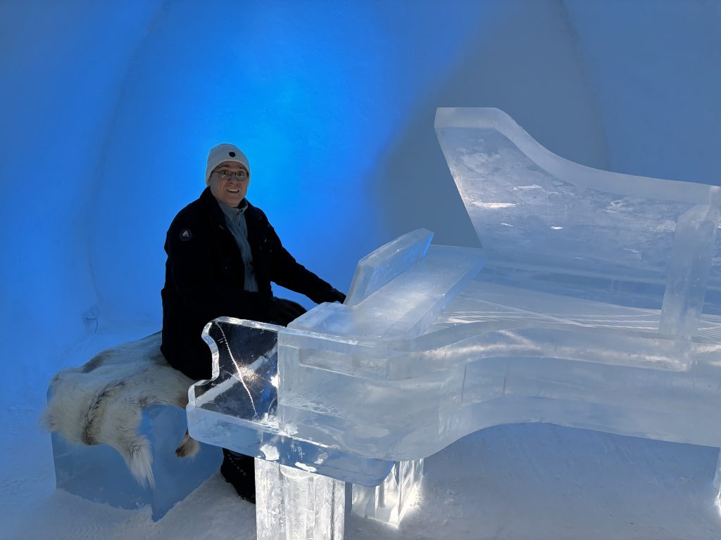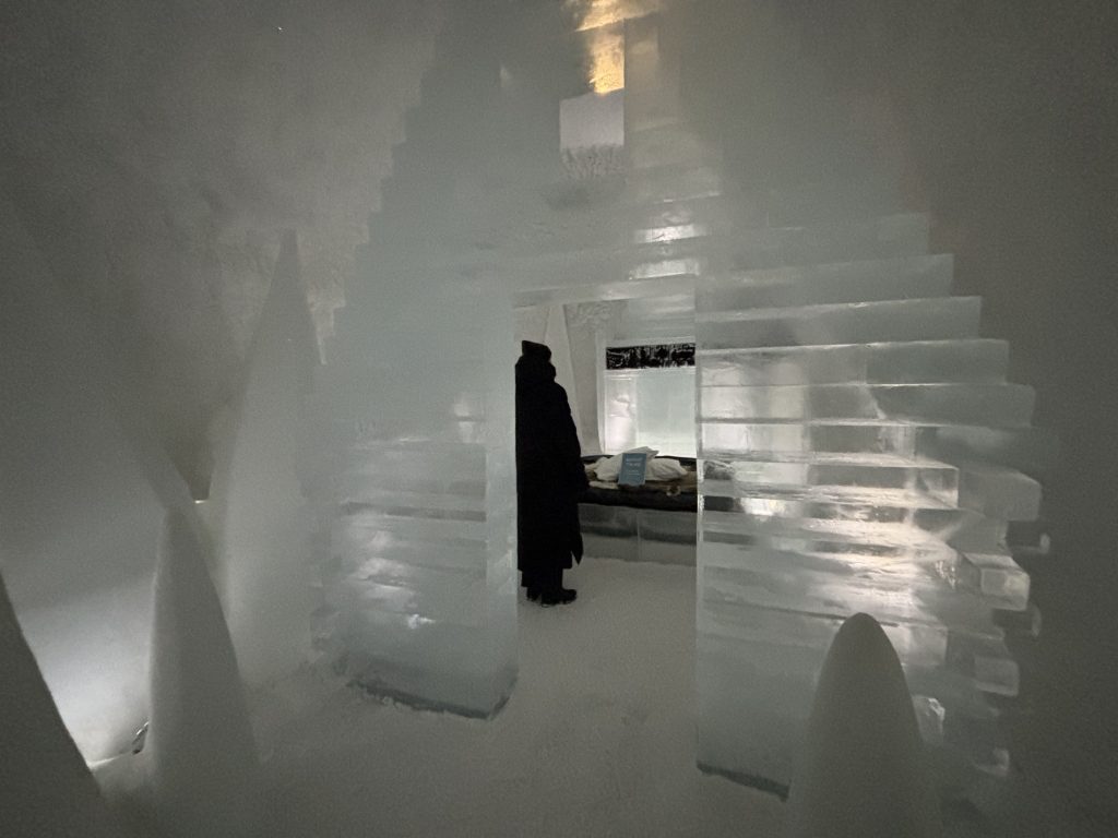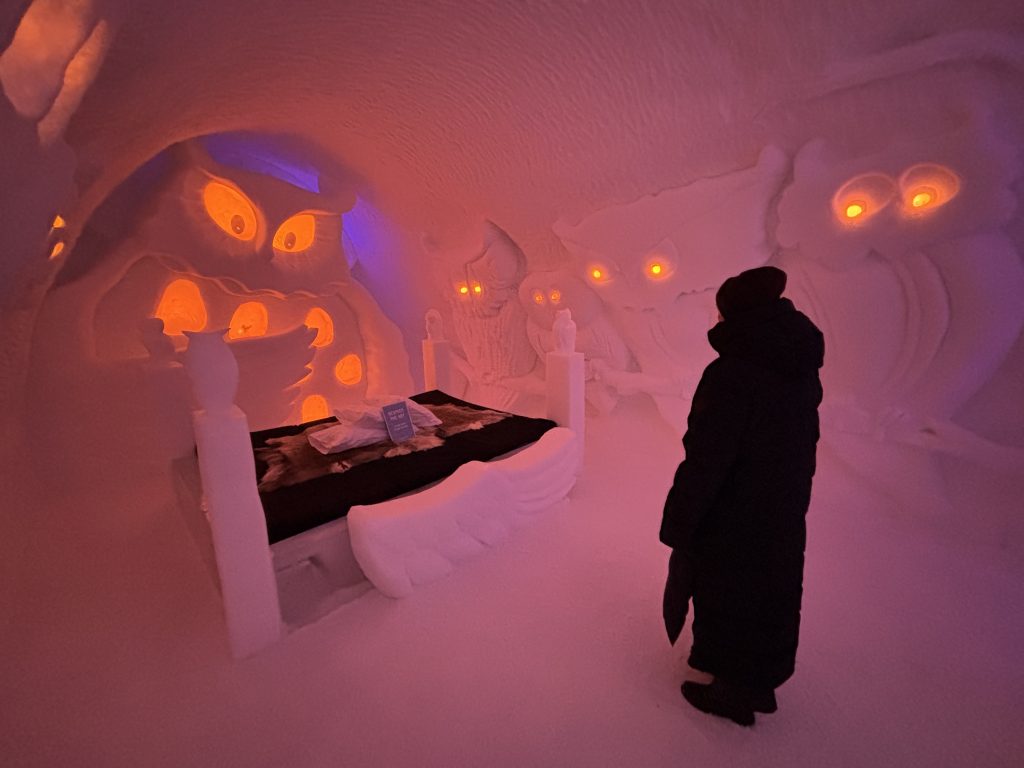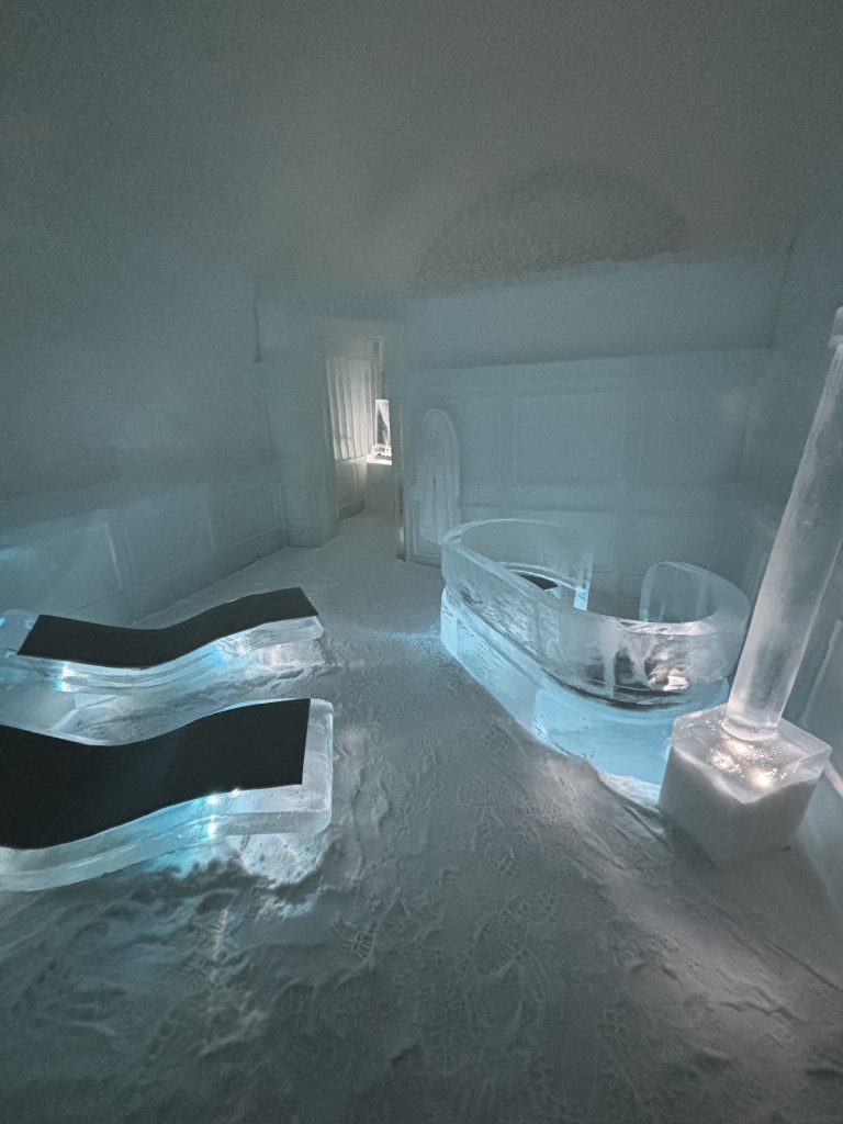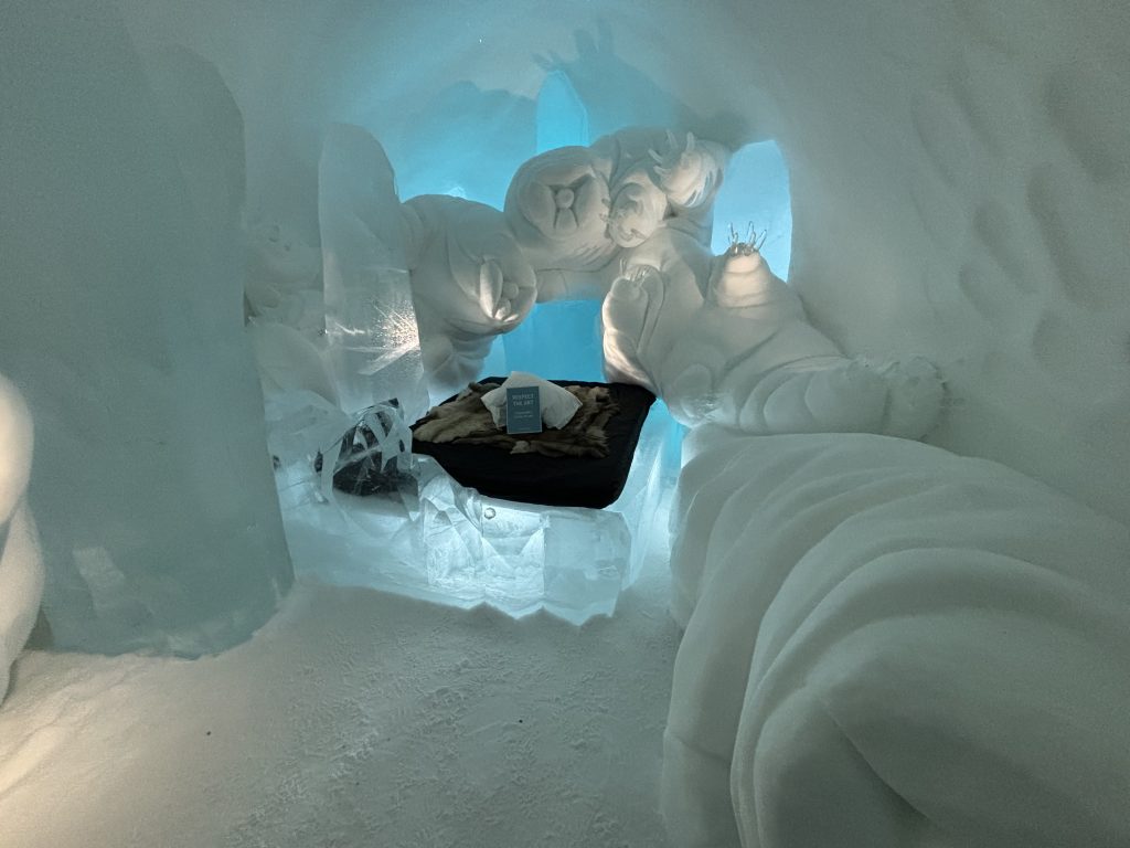 Äntligen fick Linda sin 50-årspresent. En övernattning på ishotellet i Jukkasjärvi med besök på Jokkmokks marknad efteråt. När vi kom upp till Luleå på fredagen var det väl ca 12 minusgrader. Det blev varmare i takt med att vi kom längre upp i landet och när vi nådde Jukkasjärvi var det ca -5 grader. Ruhndvandring och förberedelse inför natten innan vi gick och åt en jättegod måltid. Förrätt var rentartar på innanlår med rostade rotfruktschips, svamp och en god sås till. Huvudrätt var fjällröding med potatis och sedan en god efterrätt. På väg till hotell restaurangen fick vi även se Norrsken. Sedan var det dags att krypa ner och sova. Det var inte världens skönaste sömn eftersom det var obekvämt underlag men man frös inte i sovsäcken iallafall. Inne i rummen var det ca -5 till -8 grader. Dagen efter blev det bastu och sedan frukost. Rummen skulle man ha lämnat redan 8.30 så det blev ingen lång sovmorgon precis. Efter att ha checkat ut vid 11 tiden så åkte vi mot Jokkmokk med tankning i Kiruna, genomfart genom Gällivare och sedan lite kraftverk på vägen till Jokkmokk.